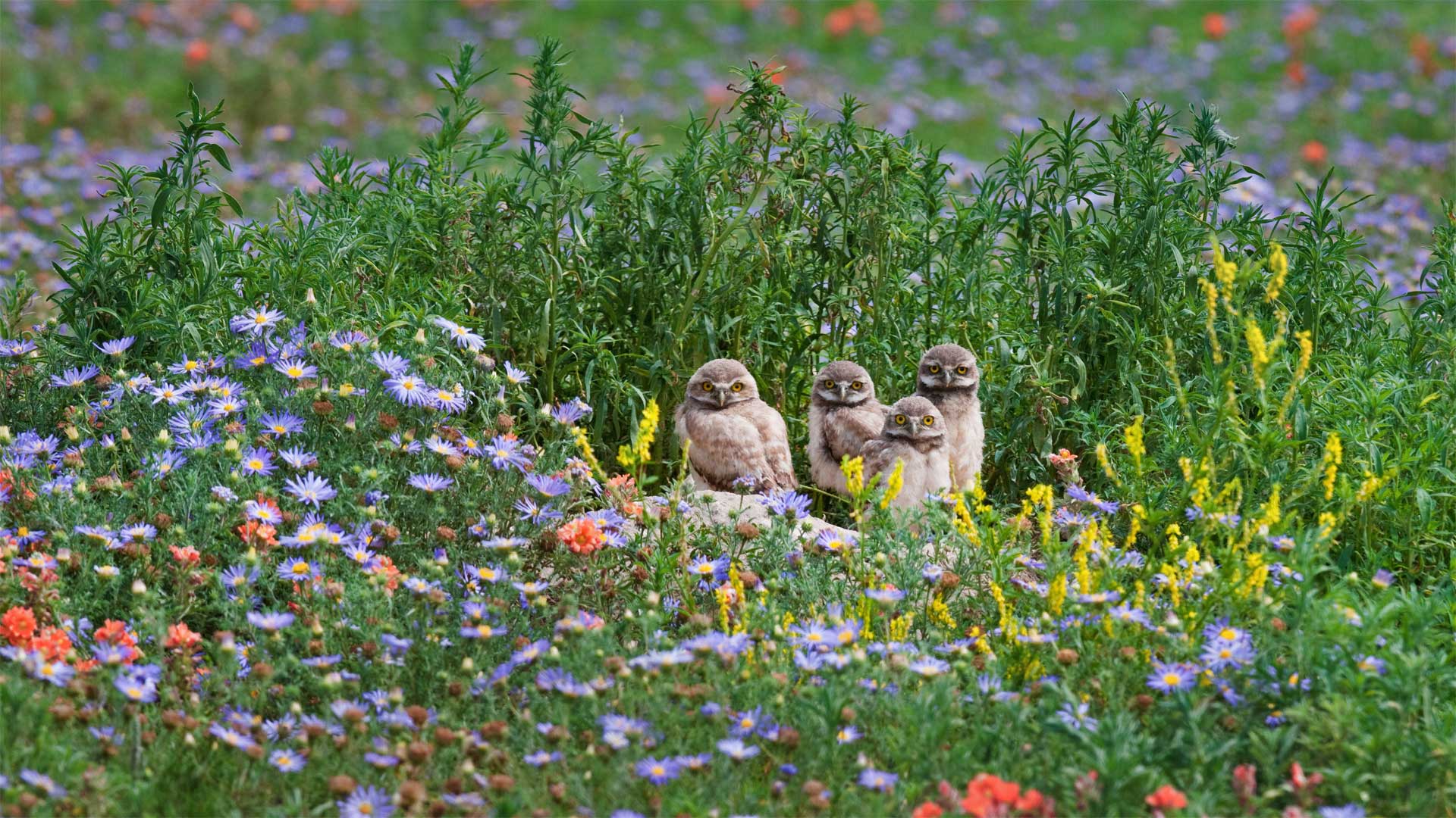 Burrowing owl chicks gaze out from among flowers near the Pawnee National Grassland in Colorado (© Roberta Olenick/Alamy)