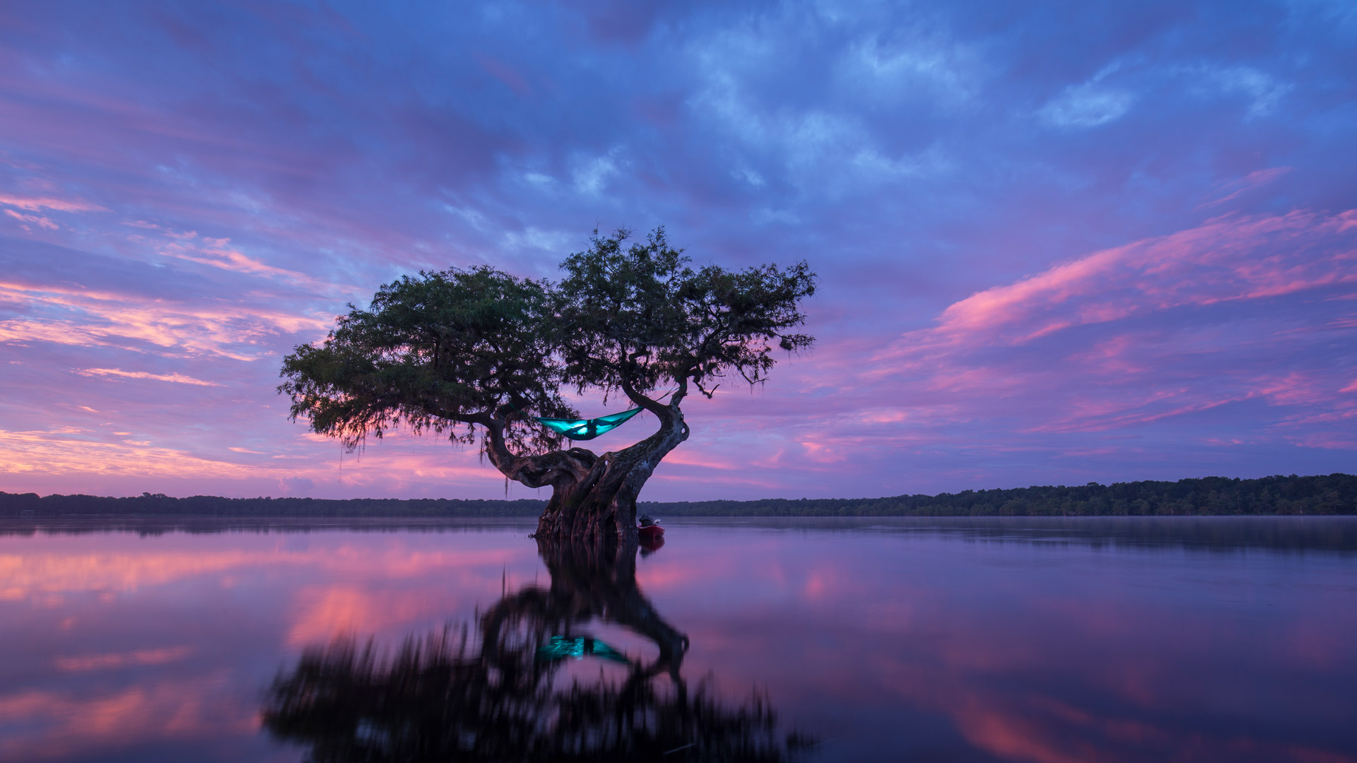 Hammock camping in a bald cypress tree, 佛罗里达州 (© Mac Stone/Tandem Stills + Motion)